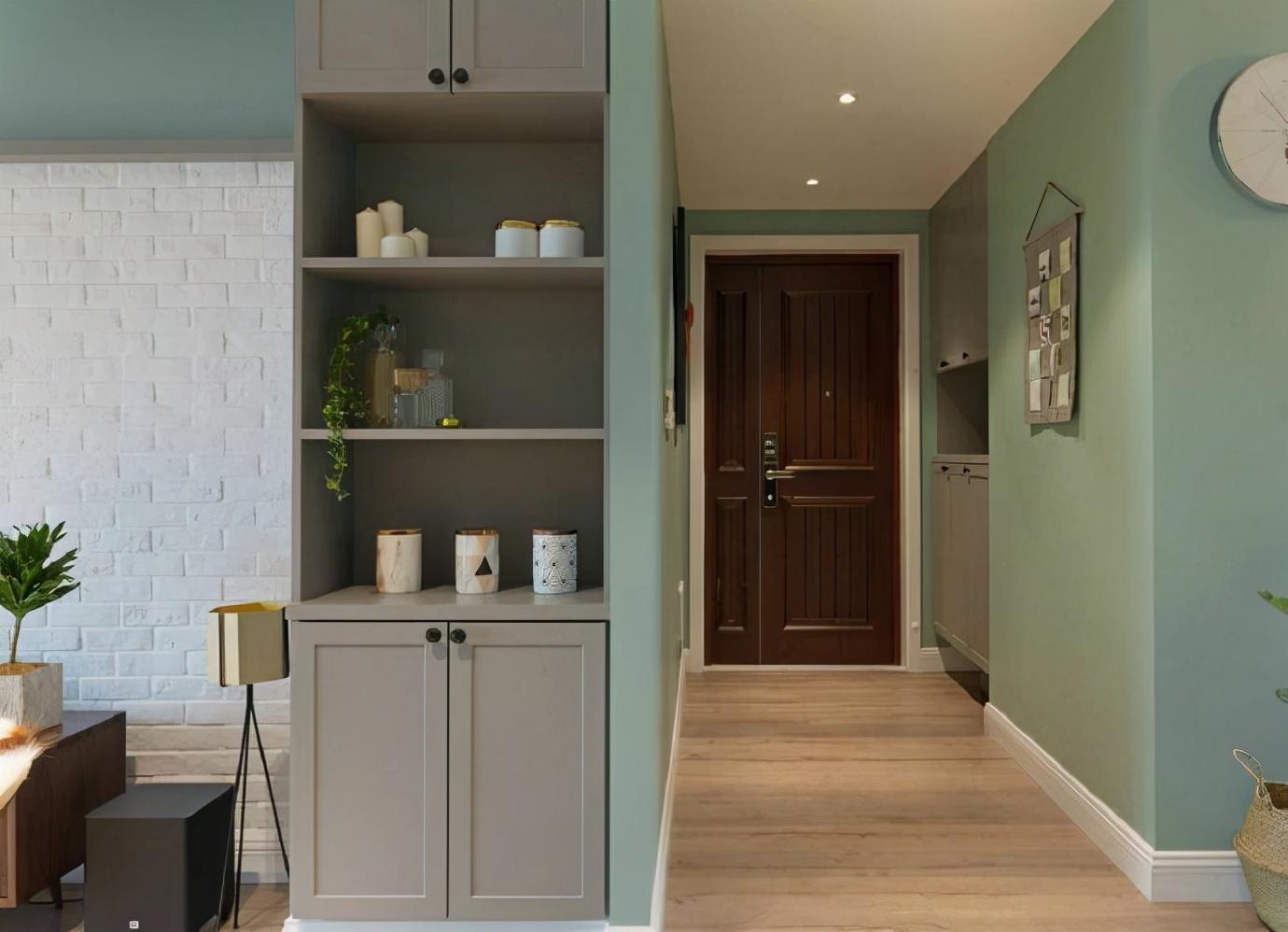 门廊和客厅之间的短走廊起到很好的缓冲作用。两侧浅色的湖绿色墙壁,浅色的原木地板和白色的天花板很好地突出了深棕色的入口门。一个关键点,主语和动词的整体外观清晰。