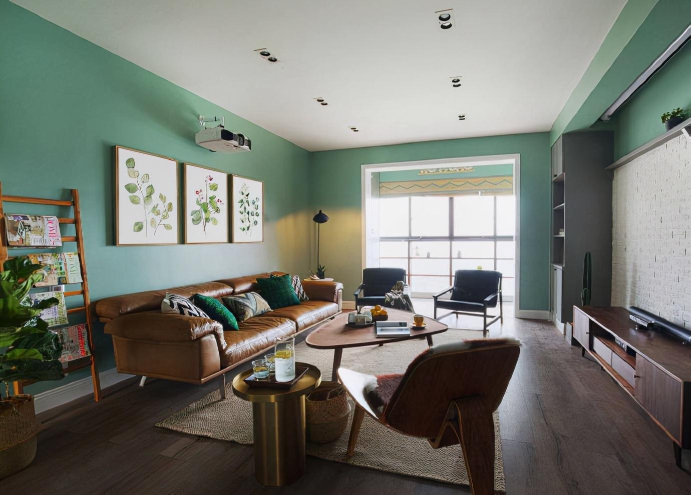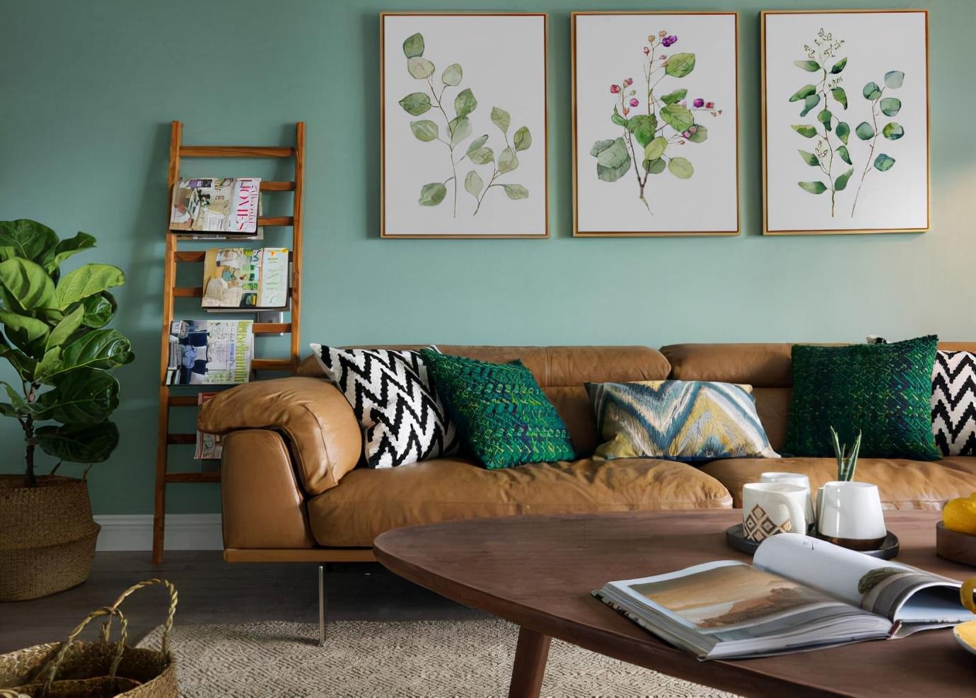 整个客厅采用浅湖绿色,非常吸引人。蜜色的皮沙发看起来很软,加上几个针织的抱枕和梯形的木制书架,显得格调十足。三幅装饰植物画并排挂在沙发后面的墙上,古朴典雅,与旁边的阔叶绿植产生共鸣,为空间增添了一份自然的气息。