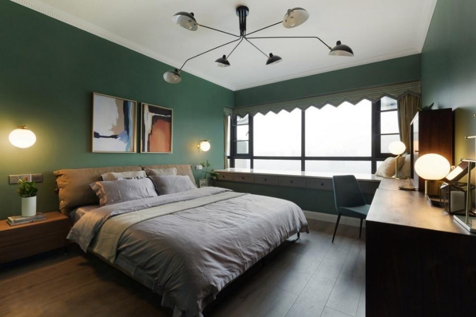 莫兰迪绿被用作父母主卧室墙壁的主色调。西安二手房改造公司设计师在整体空间没有过多的装饰,简单活泼,只用了两盆小绿植和两张床头画作装饰。窗台设计成飘窗,下方有一整排小抽屉,用来存放小衣服或小饰品,充分利用了空间。除了主灯外,四个小球形灯分布在四个角落,简洁大方。